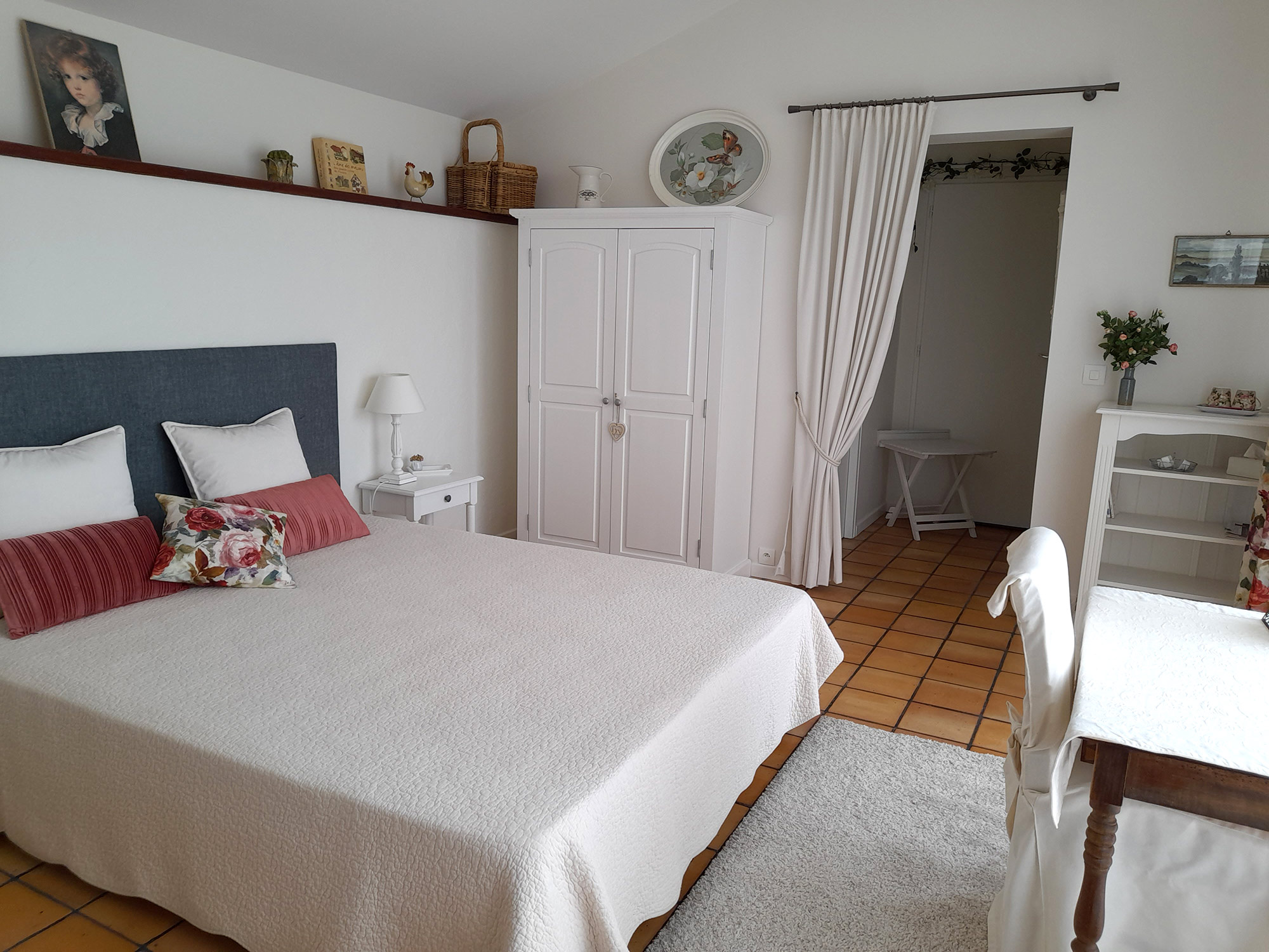 Chambre lumineuse 17m2, située au rez-de-chaussée, avec terrasse privative, vue et accès direct sur le jardin. 1 lit double 160 + 1 lit simple 90 (ou 2 lits simples 80 + 1 lit simple 90), lit bébé à disposition. Salle d’eau et WC indépendants privatifs. Draps et linge de toilette sont fournis.
